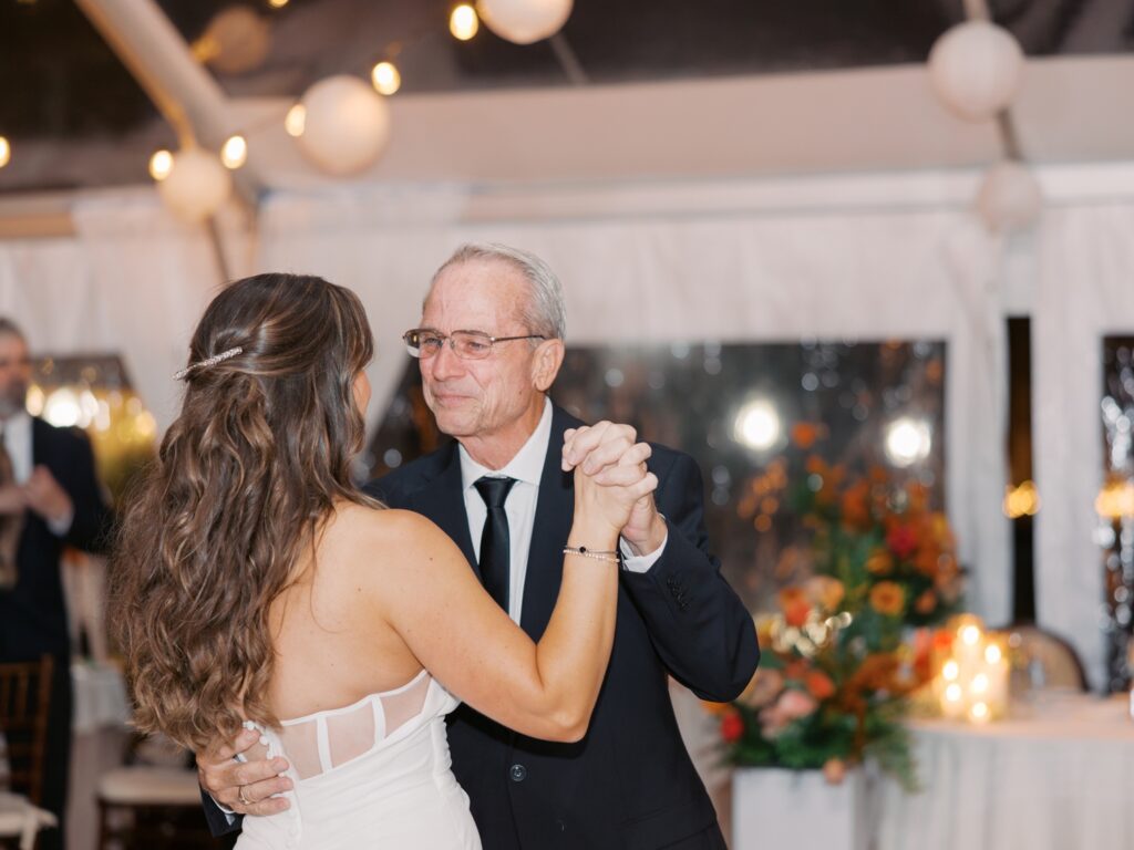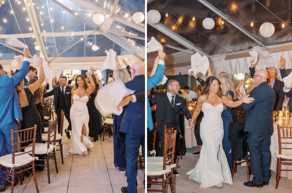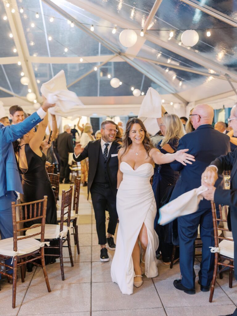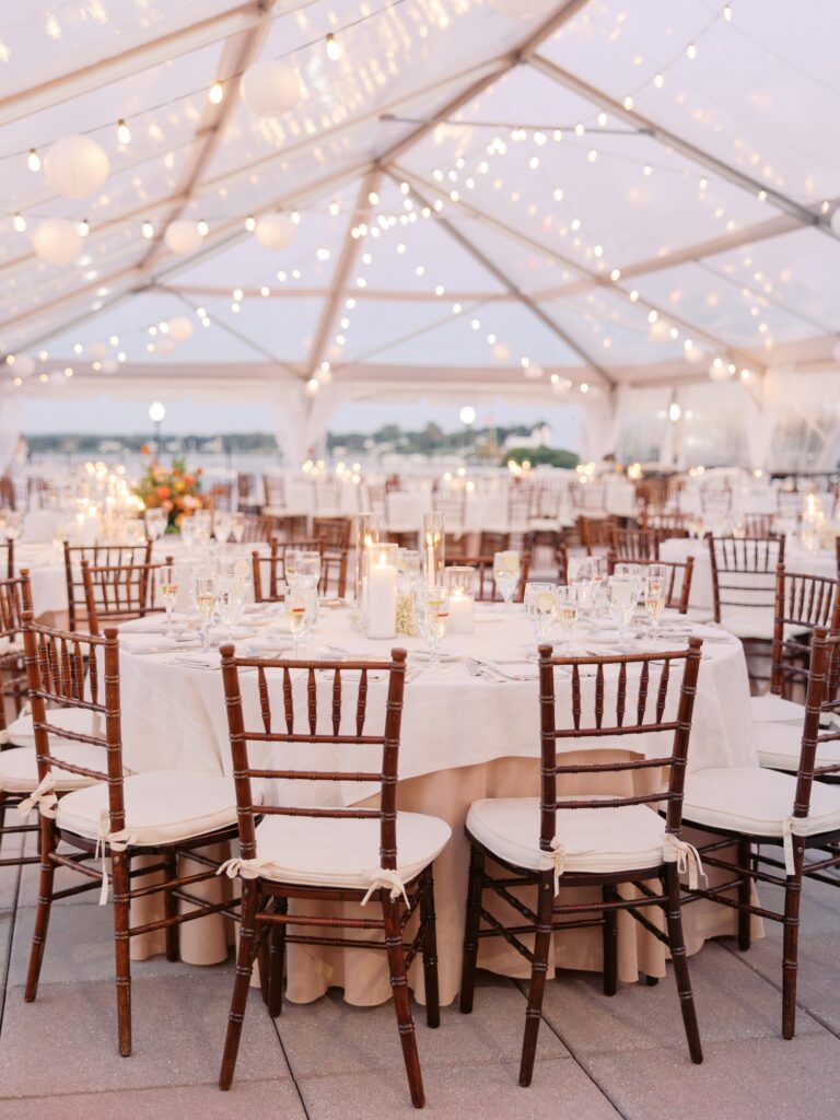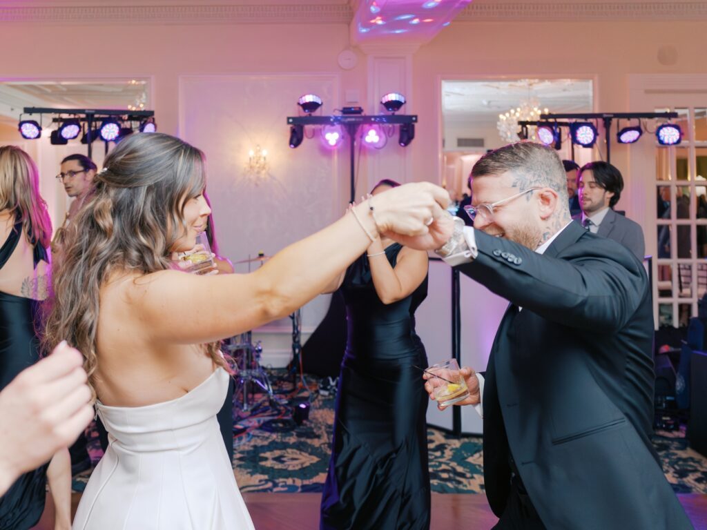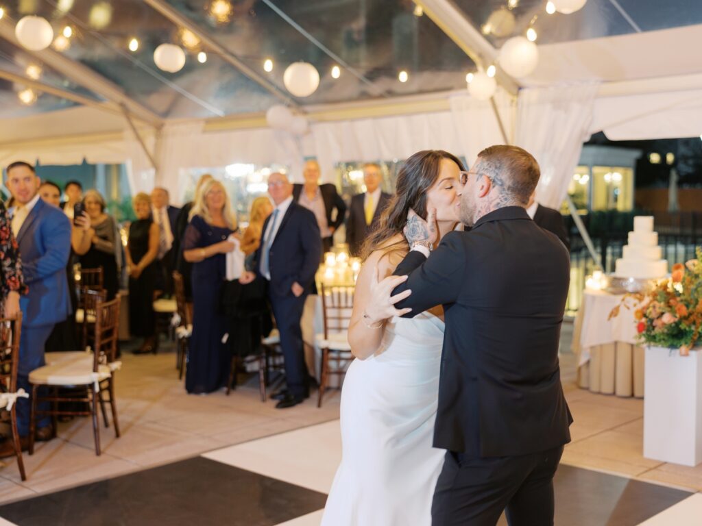 With the help of an event designer, Adriana and Marc celebrated in a tented reception on the back patio of the Molly Pitcher Inn. They shared their first dance, listened to heartfelt toasts, and enjoyed dinner and dancing before heading indoors for a lively after-party on the dance floor.