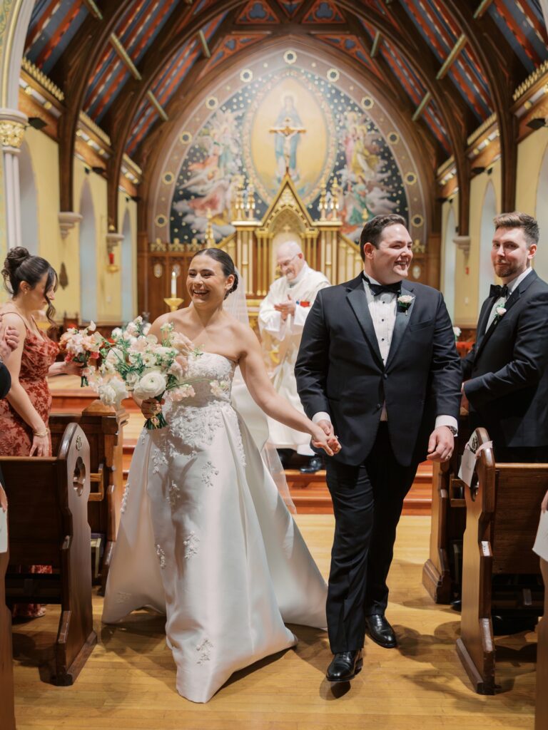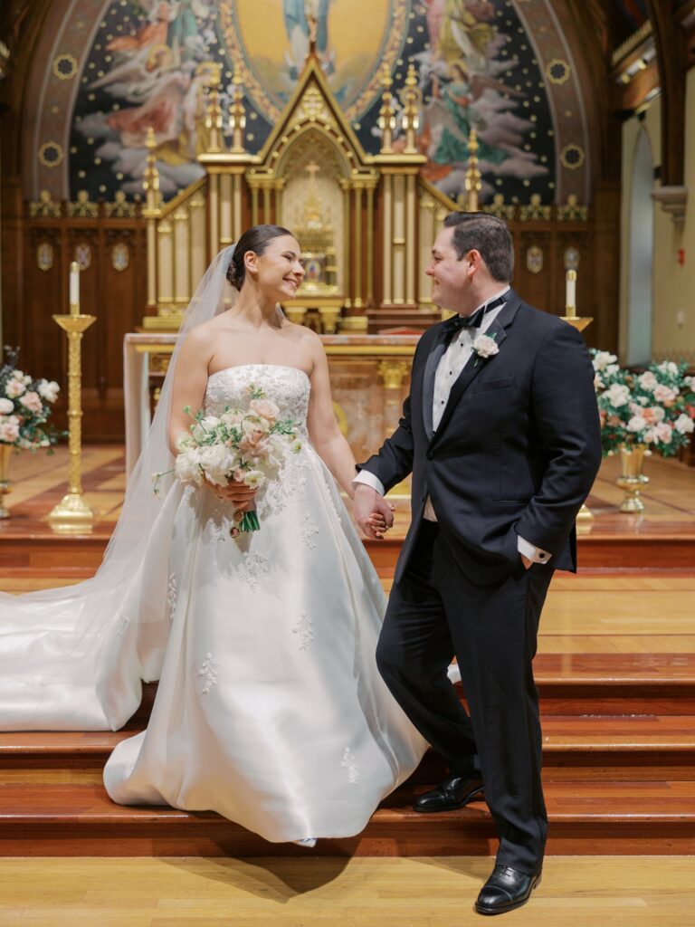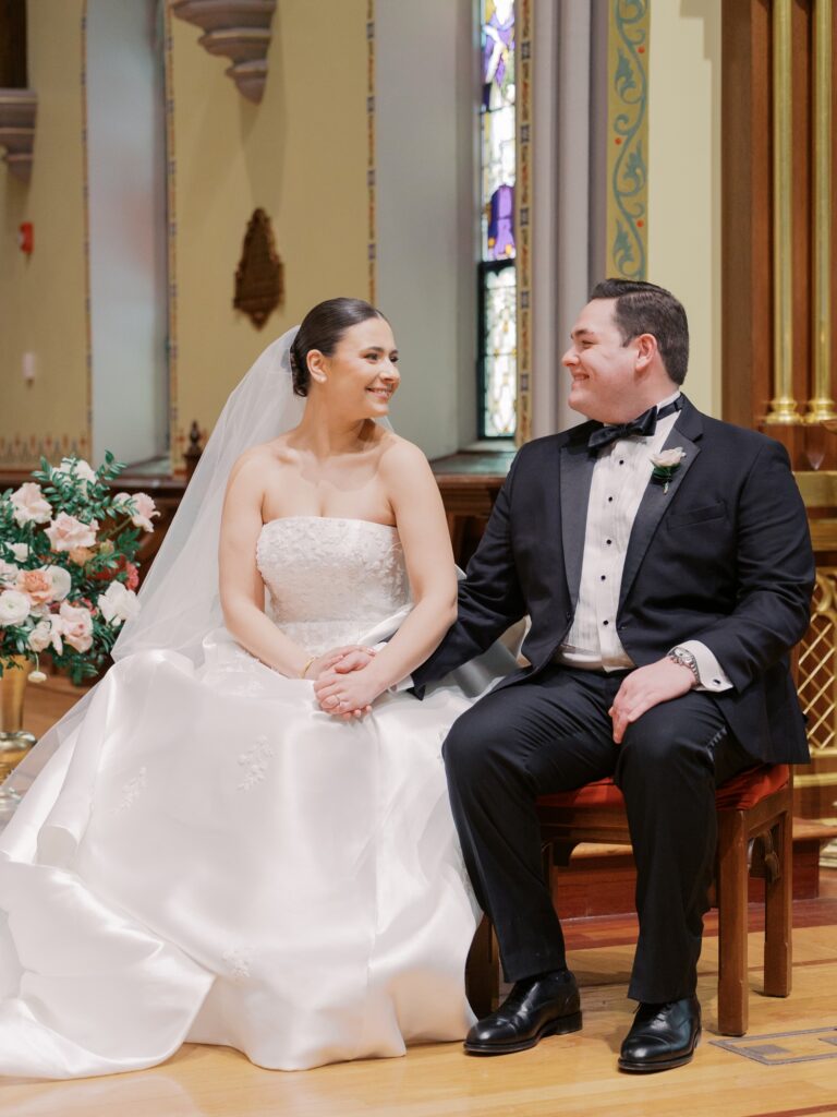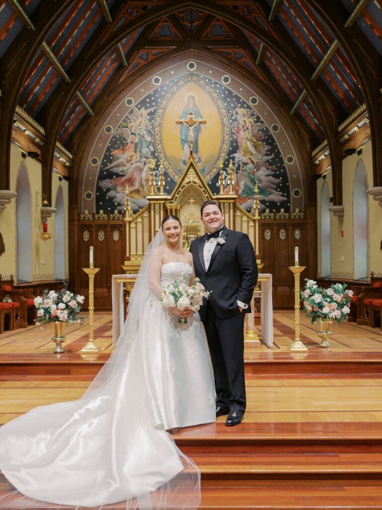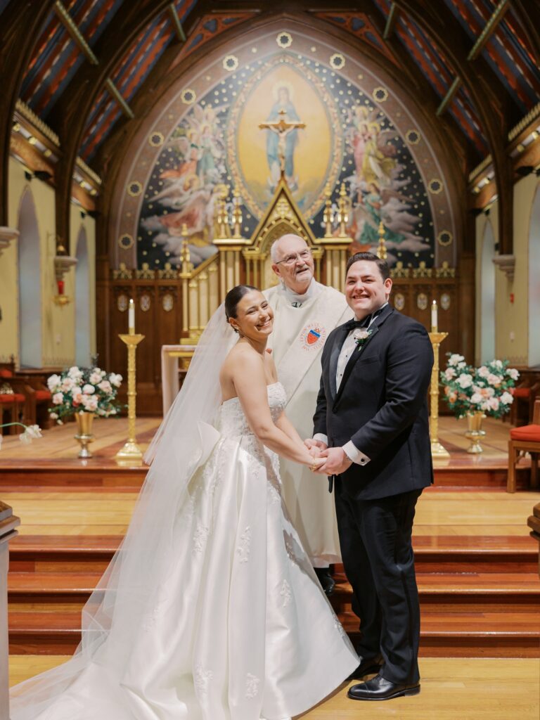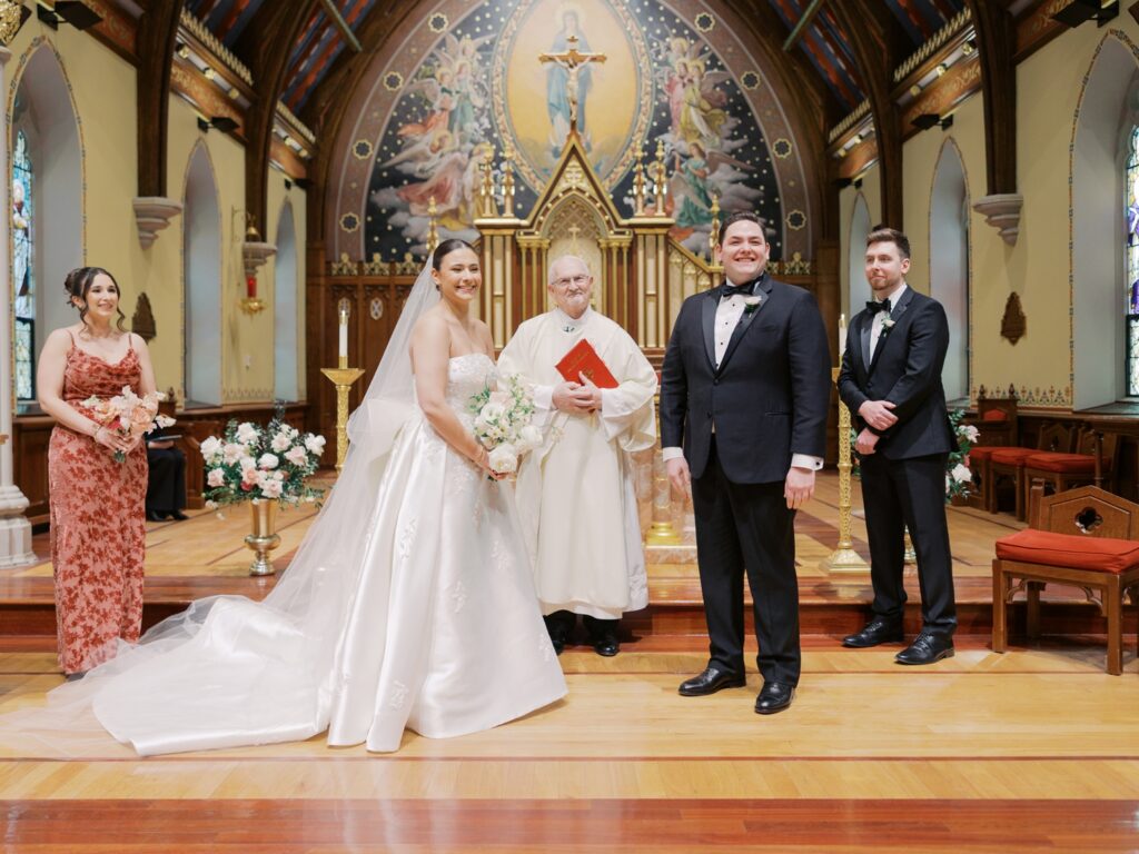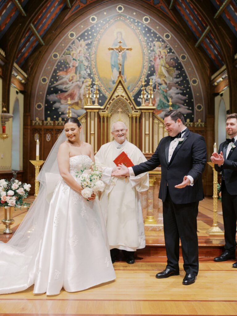 Mariella and Josh chose to see each other for the first time at the altar, so their first look happened when the church doors opened. At that moment, both of them were smiling as Mariella walked down the aisle with her dad. Josh’s grandfather, a deacon, led the ceremony, which made it feel even more personal for their families.